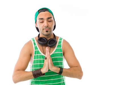 Studio portrait of young man holding hands together, pray gesture, on blue background.