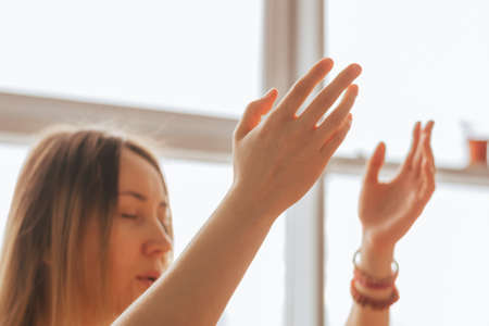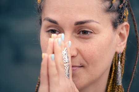 A woman is engaged in energy practice. The concept of mental health, harmony