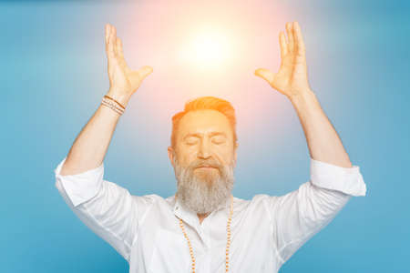 master guru meditating with closed eyes and raised hands near shining aura isolated on blue