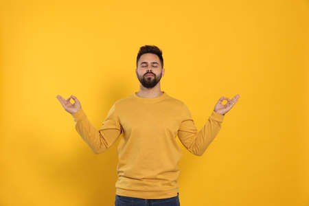 Young man meditating on yellow background. Zen concept