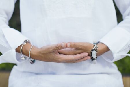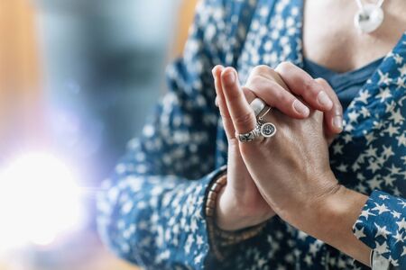 Female hands in prayer position outdoor. Self-care practice for wellbeing