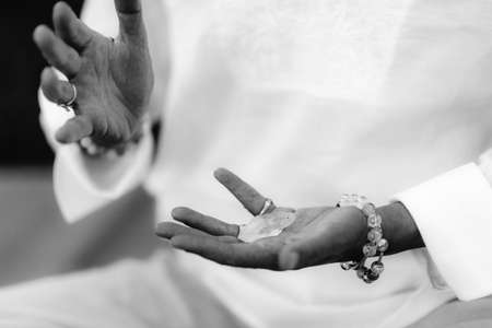 praying monk hand with tattoo on hand