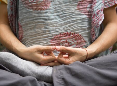 Mahamayuri Mudra. Hand gesture holding fingers in Mahamayuri Mudra for meditation, self-healing, opening of a crown chakra and increasing awareness.