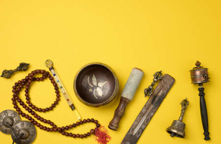 Tibetan singing copper bowl with a wooden clapper on a yellow background, objects for meditation and alternative medicine, top view, copy space