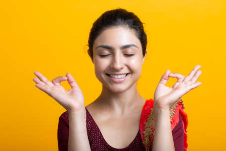 Portrait of young adult indian woman in sari meditating zen like with ok sign mudra gesture.