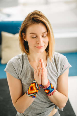 Yoga, bodycare, mindfulness and harmony concept -portrait of meditating blonde woman with closed eyes and hands combined in Namaste gesture