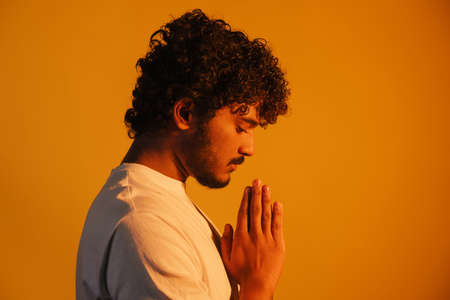 Young bearded man posing and making prayer gesture isolated over yellow background