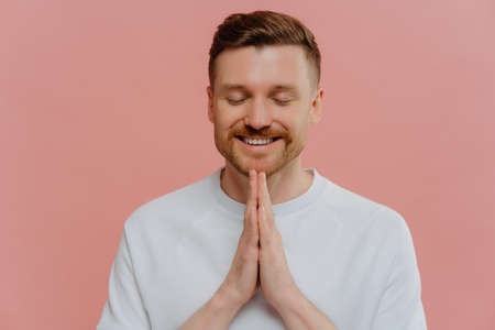 Close up studio portrait of young hopeful unshaved believer in white t shirt praying or making wish with joyful face expression, keeping hands together while standing isolated over pink background