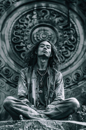 A man with dreadlocks is sitting on a rock and looking at the camera. The image has a calm and peaceful mood, as the man is meditating or contemplating