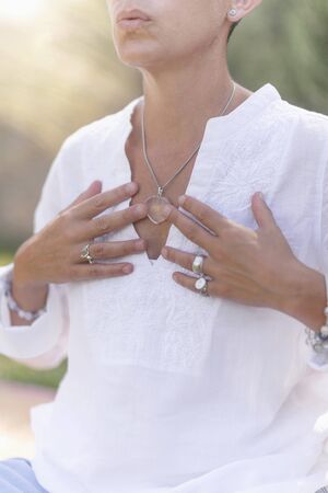 Female hands in prayer position outdoor. Self-care practice for wellbeing