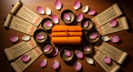Close-up of old South Asian scripts on parchment, intricate traditional decor surrounding, blank copy space