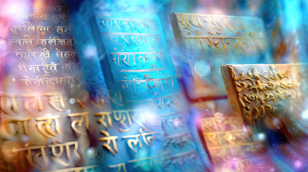 A mesmerizing blend of colorful textures featuring ancient scripts illuminated by ethereal light. Perfect for themes of culture, spirituality, and creativity.
