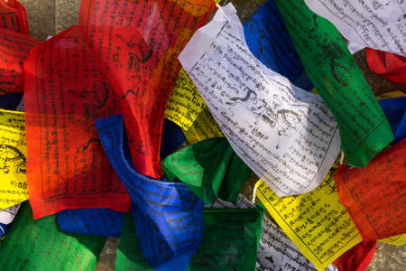 Buddhist colorful prayer flags with printed mantras. Religion symbols