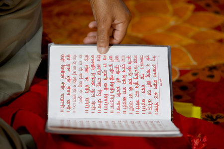 Jain religious scripture Kalpa Sutra placed on a decorated cloth with an oil lamp. High angle view, copy space