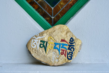 The Sanskrit mantra 'Om mani padme hum' inscribed and painted on a mani stone embedded in a wall of the Potala Palace in Lhasa, Tibet, China.