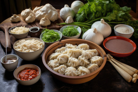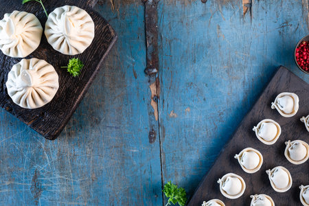 Chinese dumplings?? jiaozi on table flat lay view. Lunar new years. Chinese New Year. Asian festive food