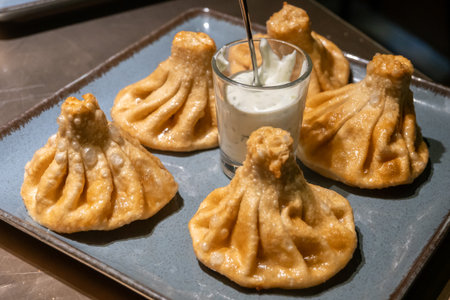 Plate of golden fried khinkali, a traditional Georgian dumplings with a dipping sauce