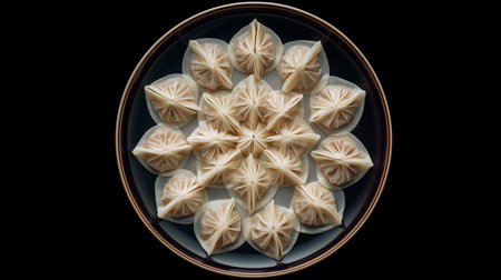 Artistic top view of traditional Asian dumplings meticulously arranged in a geometric star shape. Elegant food photography featuring intricately pleats on a dark plate over black background.