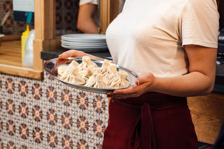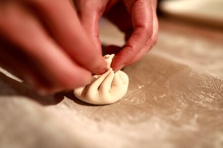 Close-up of hands, khinkali. Khinkali with meat in the hands of a woman close-up. The process of cooking kinkily - dishes of Caucasian cuisine.