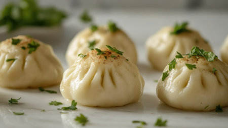 A vibrant close-up image of freshly made dumplings garnished with herbs, showcasing their delicate texture and appetizing appearance, perfect for food enthusiasts.