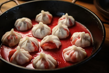 Steaming georgian khinkali dumplings served in a black pan with rich tomato sauce