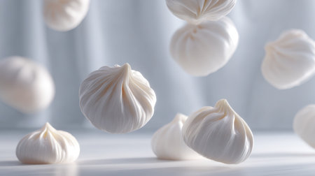 A captivating scene featuring floating dumplings in mid-air against a soft light backdrop. This image showcases the delicate craftsmanship and delicious appeal of Asian cuisine, perfect for food lovers and culinary enthusiasts.