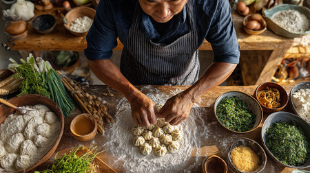 aerial view of top 10 best dumpling styles captured in high detail with the goerz hypergon 65mm f8 lens. these close-up shots showcase the exquisite phoenician art-inspired dumplings, all available for under 20 dollars. the sepia tone adds an oriental touch to the visually appealing images. ai generated