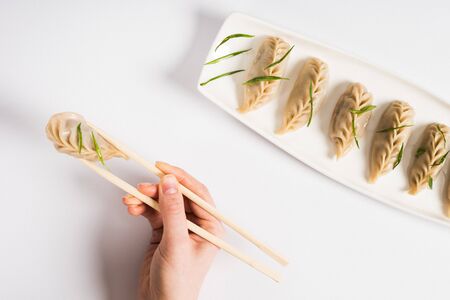 cropped view of woman eating delicious Chinese boiled dumplings with chopsticks on white background