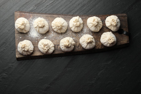 Pile of homemade raw khinkali dumplings close up on the stone rustic table. Top view and copyspace