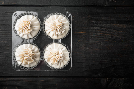 Uncooked Baozi chinese dumplings. Azian dumplings set, in plastic tray, on black wooden table background, top view flat lay, with copy space for text