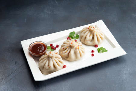 Meat filled Georgian dumplings Khinkali served with spicy tomato sauce Satsebeli on a white plate