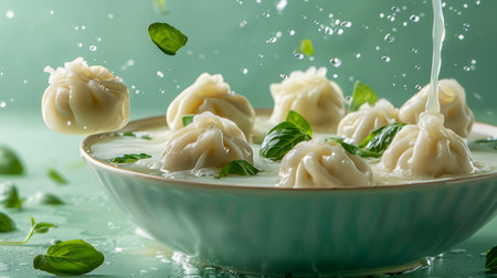 Fresh Asian Dumplings in Broth with Basil Garnish Splashing in Bowl on Green Background AI Generative