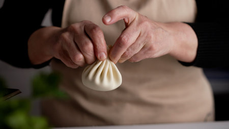 Chef skillfully prepares a traditional Georgian dumpling, demonstrating the intricate process of filling and pleating the dough. Chef preparing dumpling: a culinary masterpiece