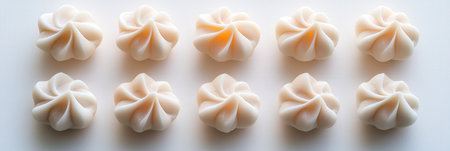 Editorial, extreme close-up macro photograph capturing several freshly prepared, uncooked, white glu