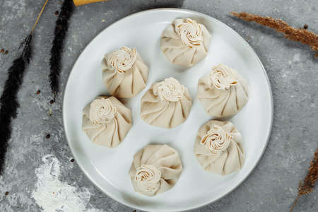 Traditional manti food on plate, top view. The concept of oriental cuisine. Uzbek food manty dumplings. (Turkish name; hinkel manti)