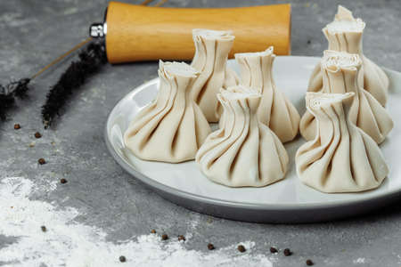 Pile of homemade raw khinkali delicious Georgian dumplings on home kitchen table