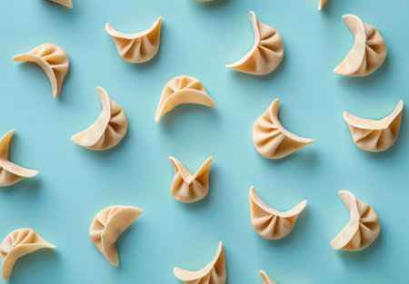 Aerial view of various raw dumplings arranged on a light blue background, showcasing their unique shapes and textures