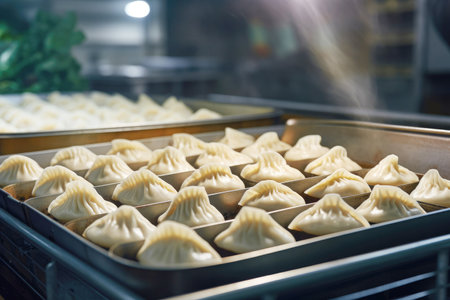 Steamed dumplings on a metal tray in a restaurant kitchen