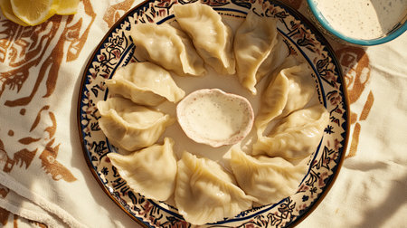 A plate of freshly made dumplings arranged neatly with a small bowl of creamy dipping sauce. A side of lemon adds freshness.
