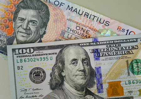 Portraits on banknotes. US 100 dollar bill and Mauritius 1000 rupee bill. Close up.