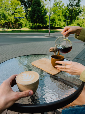 First-person view: couple enjoying coffee at outdoor cafe table, pouring rich coffee into cup while small brown dog sits nearby, basking in warmth of sunny summer day. Pouring coffee into mug
