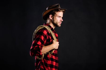 Man unshaven cowboy black background. Man wearing hat hold rope. Lasso tool of American cowboy. Lasso is used in rodeos as part of competitive events. Lasso can be tied or wrapped. Western life