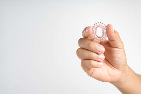 Squeeze, apply force. Soft toroidal rubber expander for the development of palm muscles in the female hand, blue background