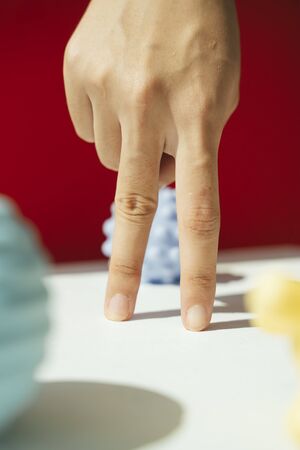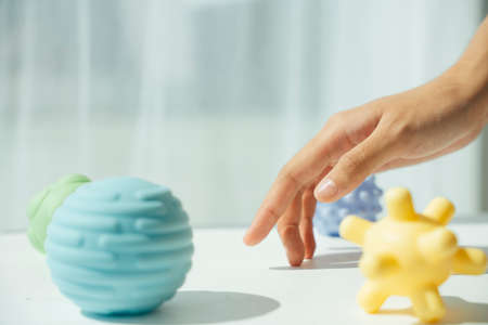 Details with the hand of a woman kinetotherapy medic (physical therapist) showing finger rehabilitation therapy