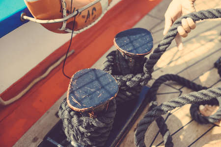 Man hand with boat rope, yachtsman tying sea knot. Human hand on sailing boat or yacht tying a knot, close up view