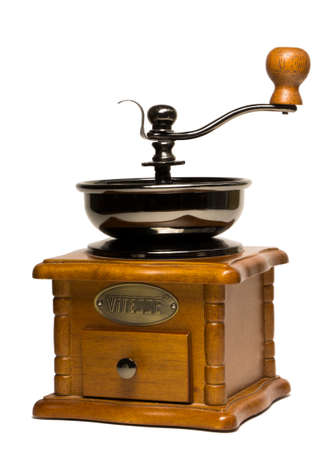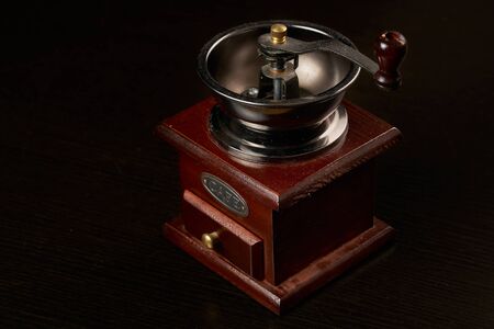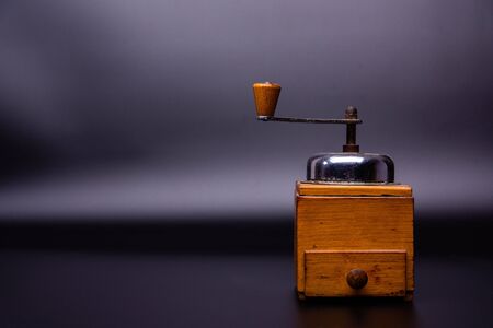 Manual coffee grinder for grinding coffee beans. Black background. Vintage coffee grinder