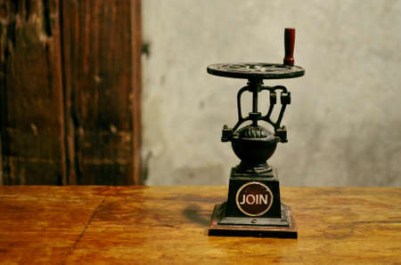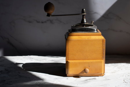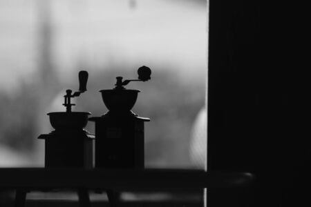 Vintage coffee grinder. Two manual coffee grinders for grinding coffee beans on table.