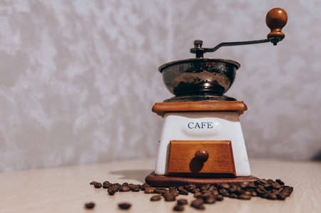 Old manual coffee grinder and beans on wooden table. Copy space for text. Selective focus