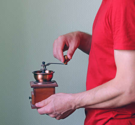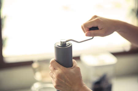 Manual coffee grinder in the hands. Home manual brewing still life. Third wave speialty coffee aesthetics