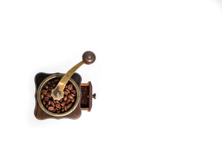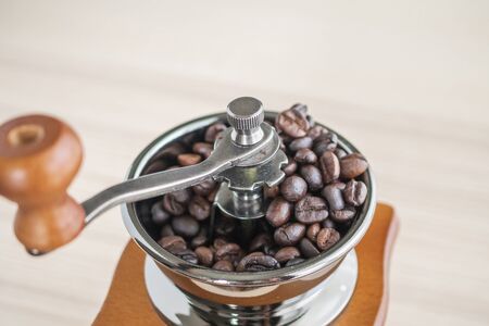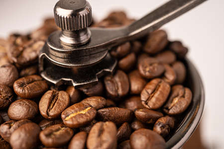 Coffee beans in a hand grinder, closeup roasted coffee beans into a manual coffee grinder
